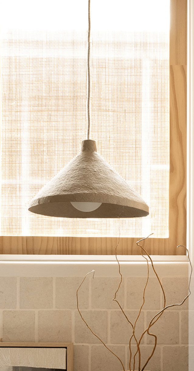 handmade in Southern Africa from a pulp blend of 100% waste magazines and waste coffee grounds. Its iconic cone form and organic texture make it perfect for bedside lighting, smaller dining areas, or kitchen islands.