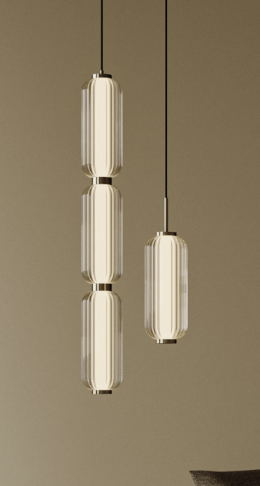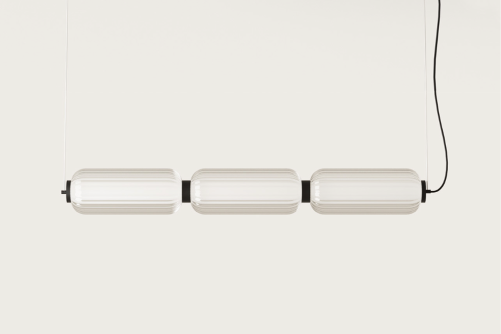 a linear decorative pendant that combines three glass cylinders with opal acrylic centres for a luminous, delicate effect. Its sleek design, joined by circular metal end pieces, creates a refined balance between solidity and lightness.