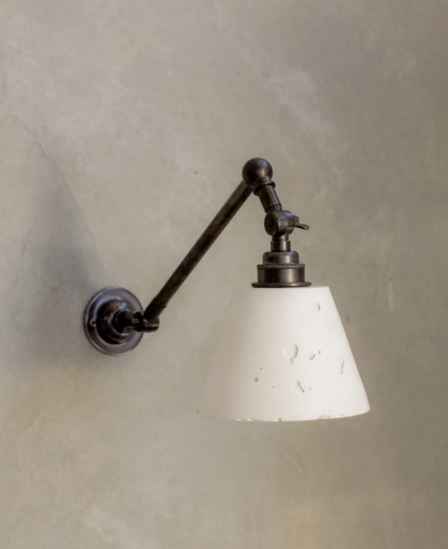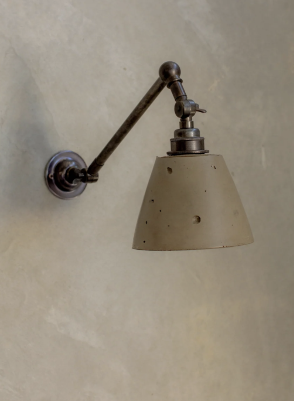 a bold statement piece combining mid-century modern influence with contemporary minimalism. Its wide conical concrete shade provides organic tactility, while the adjustable arm adds flexibility and sophistication. Durable and consciously crafted, this wall light is perfect for reading nooks, bedsides, or feature walls.