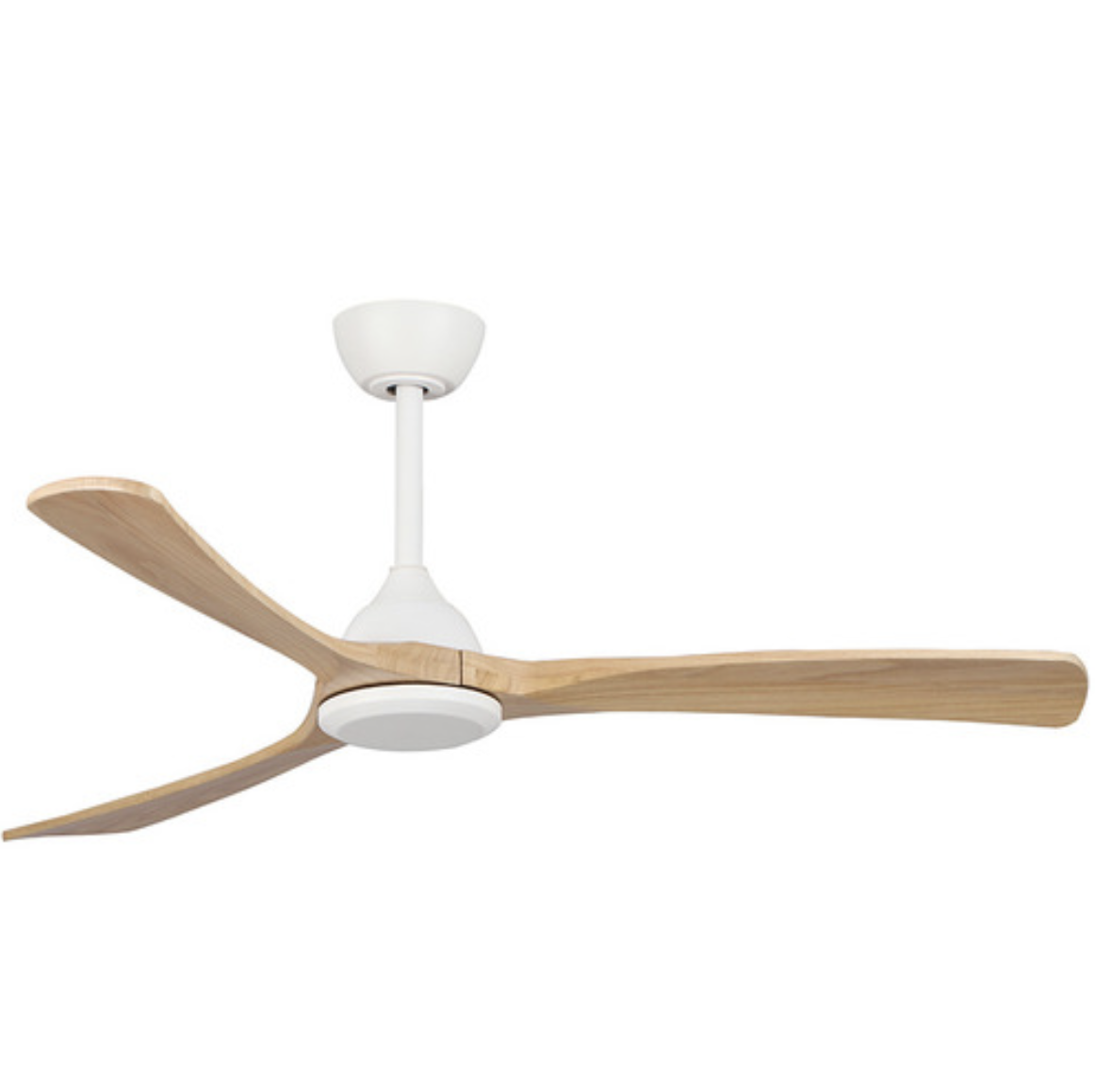 A premium ceiling fan featuring solid timber blades and a quiet, energy-efficient DC motor. Available in 52", 70", 86", and 92" sizes, it's suitable for indoor, outdoor undercover, and coastal installations. The fan offers a modern aesthetic with various finishes and includes a 6-speed remote control with timer and reversible functions.